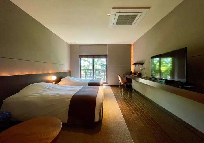 ツインベッドを設置した一番基本的なお部屋です。リラックス効果の高いジャクジーバスを備えております(温泉ではございません)。